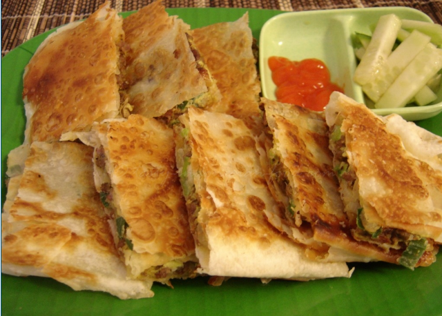 To make Martabak, place two teaspoons of filling in the middle of the dough. Then, take the skin and fold it in from side to side so that it completely covers the filling in an envelope shape. Turn it over to cook the other side after frying it until one side is golden brown. Warm up and serve.